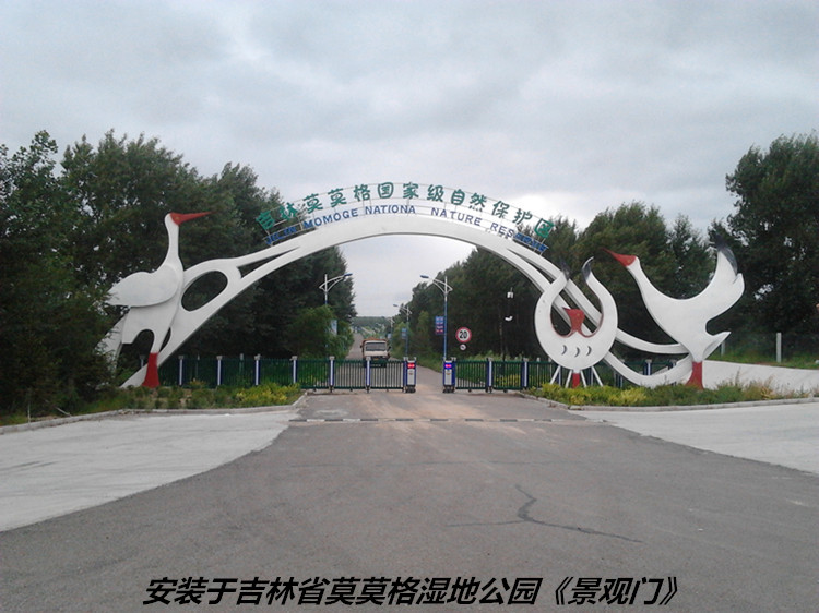 安装于吉林省白城市莫莫格湿地公园《景观大门》 材质为:内钢材骨架,外为不锈钢板,表面喷涂氟碳漆。