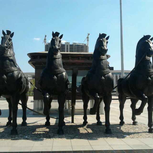 济南西客站东广场疏散口铜车马雕塑群,材质:青铜铸造、锻铜;长度15米,高度4.5米;共6组。 雕塑以四马一车为一